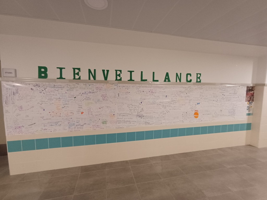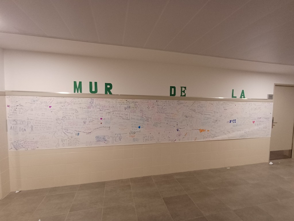À l’occasion des Semaines Nationales de Lutte contre le Harcèlement, Mme Duchêne, Conseillère Principale d’Éducation, et son équipe ont mis en place le Mur de la Bienveillance dans le couloir du bâtiment C.