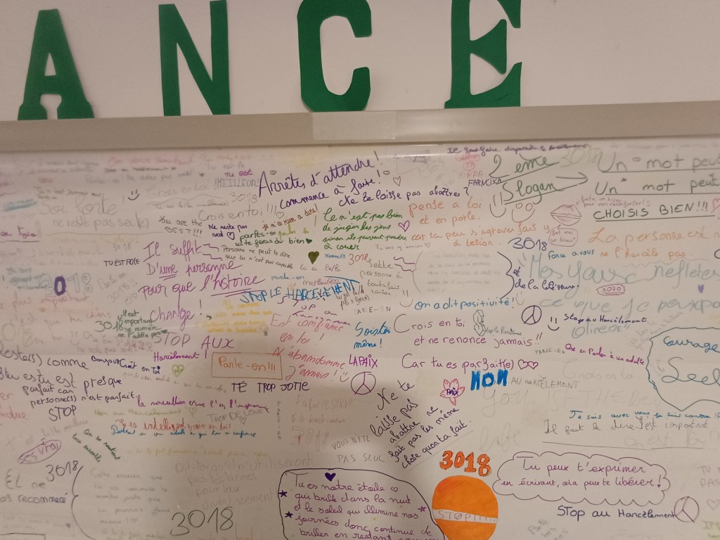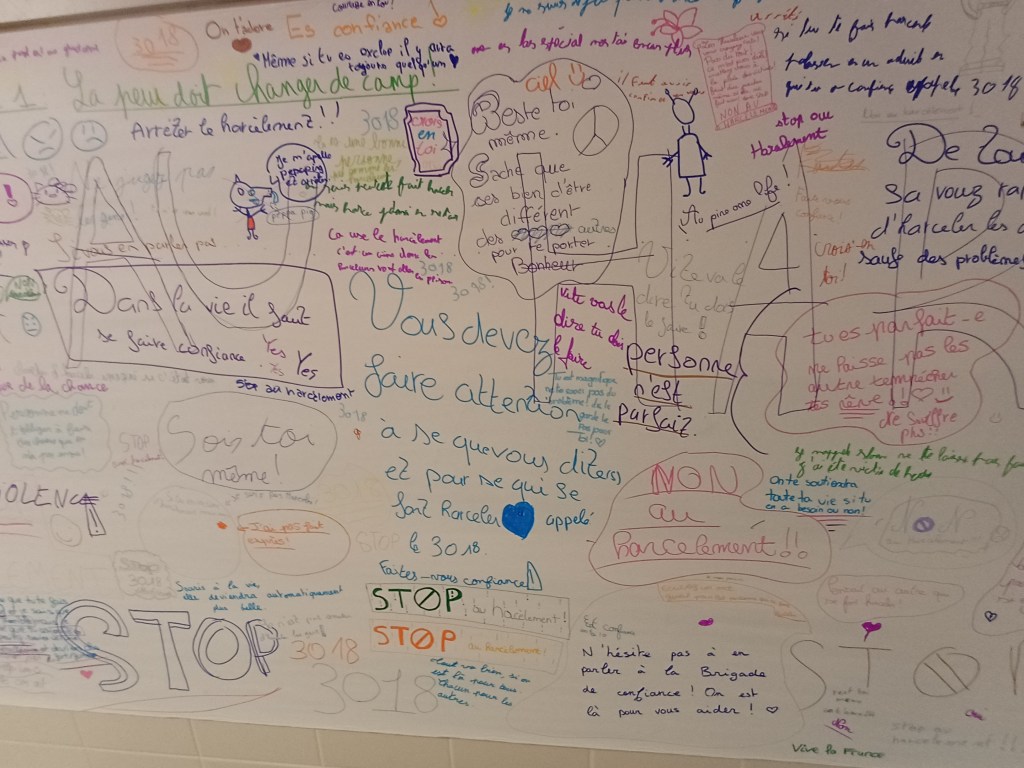 Cette banderole en accès libre a permis aux élèves de s’exprimer, soit en partageant des mots bienveillants et encourageants, soit en donnant des conseils à ceux qui pourraient être victimes de harcèlement.